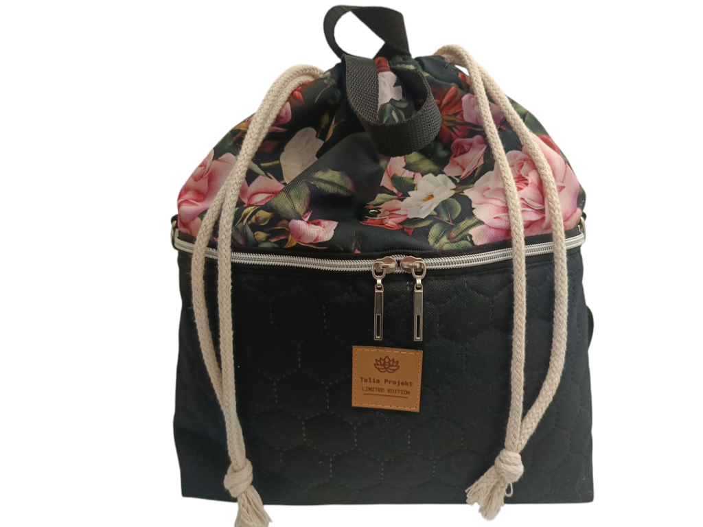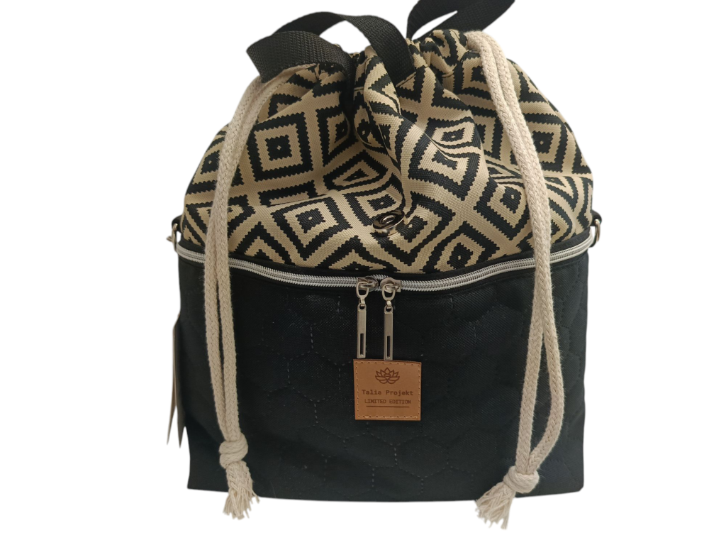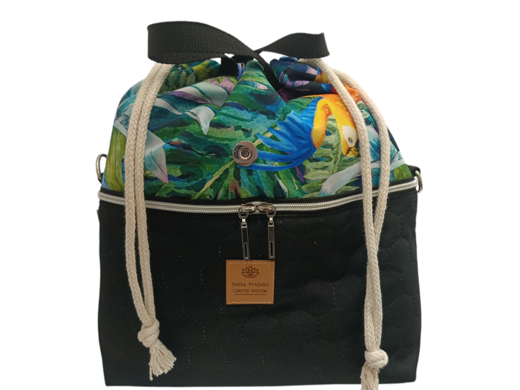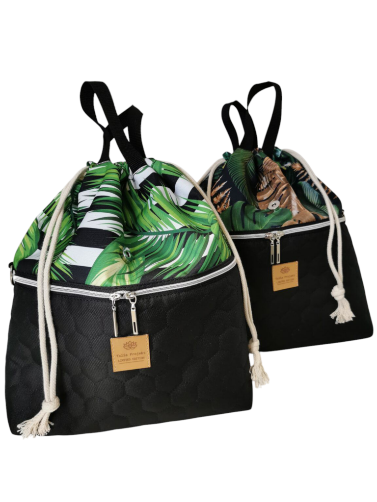 Torebko-plecak z regulowanymi paskami i dodatkowymi uchwytami. Uszyte w prostej formie, z ciekawym połączeniem materiałów, o bogatym wzornictwie i kolorystyce. Jest niesamowicie lekki i wygodny. Posiada funkcję pomniejszania na magnez i kieszeń zewnętrzna na zamek. Zastosowano wysokiej jakości tkaniny wodoodporne. Sznury do zawiązywania w 100 % bawełniane. Podszewki wodoodporne z dwoma kieszeniami wewnętrznymi. Stosowane są specjalne nici dla podniesienia trwałości produktów. Wszystkie uszyte modele powstają tylko w limitowanych edycjach. Zaprojektowane i uszyte w Polsce.